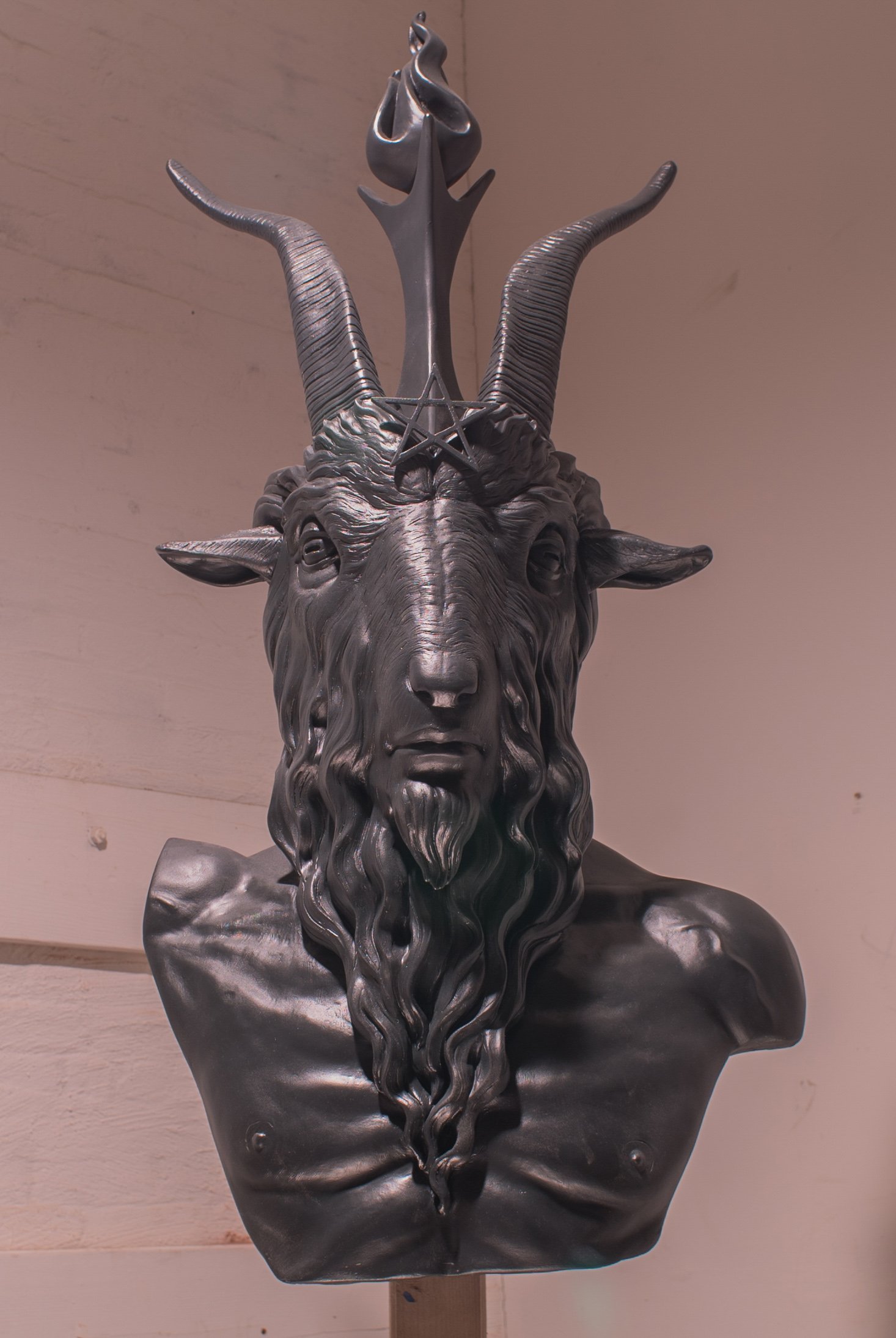 The statue of Baphomet is a bronze sculpture commissioned by The Satanic Temple depicting Baphomet, a winged, goat-headed, humanoid and a symbol of the occult. First unveiled in Detroit in 2015, the statue stands 8.5 feet (2.6 m) tall, weighing over 3,000 lbs., and features a prominent pentagram as well as two smiling youths gazing up at the seated central figure. Petitions to display the piece on public grounds have resulted in arguments concerning the separation of church and state. Production of the statue, and its initial notoriety, is featured in the documentary “Hail Satan?”